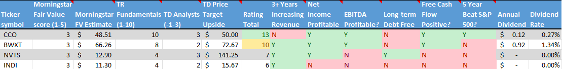 New to the list are Dollarama (TSX: DOL), a large Canadian company that operates dollar stores across Canada; Deere & Company (NYSE: DE), a large American company that manufactures and sell agricultural equipment worldwide; and Walmart (NYSE: WMT), a big American retail and wholesale company that operates globally. All are well-known companies, pay less than a 1.5% dividend and score well on the Radar Test, as seen in the tables below.