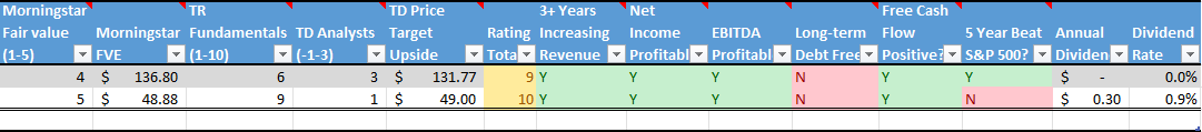 No company has stood out for me, so I am just sitting on cash, waiting for the appropriate time to deploy it. Since I was looking at Alvopetro Energy (TSXV:ALV), I decided to look at two other energy companies within the portfolios, Crew Energy (TSX:CR) and International Petroleum (TSX:IPCO). Turns out they all look decent. I like that Alvopetro provides a 6% dividend, even though Crew and IPCO score slightly higher in the Rating Total column (the total of TR Fundamentals and TD Analysts scores). Outside of energy companies, I still like STMicroelectronics N.V. (NYSE:STM), Alphabet (NASD:GOOGL).