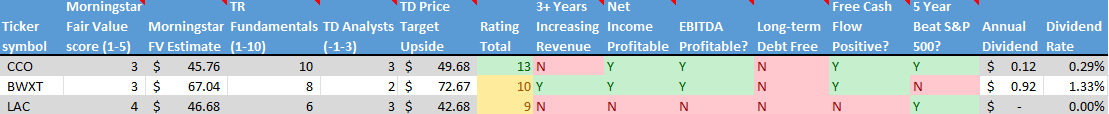 • Lithium Americas (TSX: LAC): A mid size Canadian company operating lithium mines in the USA and Argentina. They are a provider of lithium to the emerging electric vehicle battery industry.
